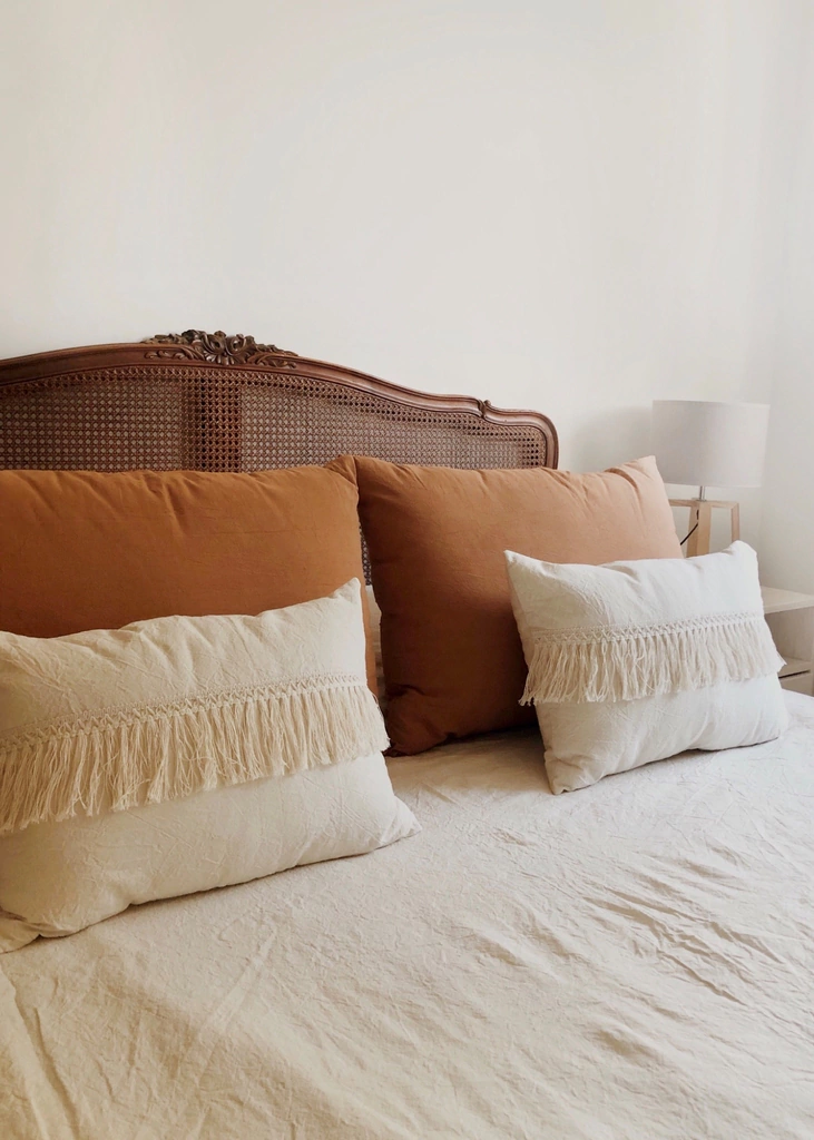 Almohadón rectangular relleno de vellón siliconado, con funda desmontable confeccionada artesanalmente en lienzo 100% algodón. Mi funda viene con cierre escondido en solapa.