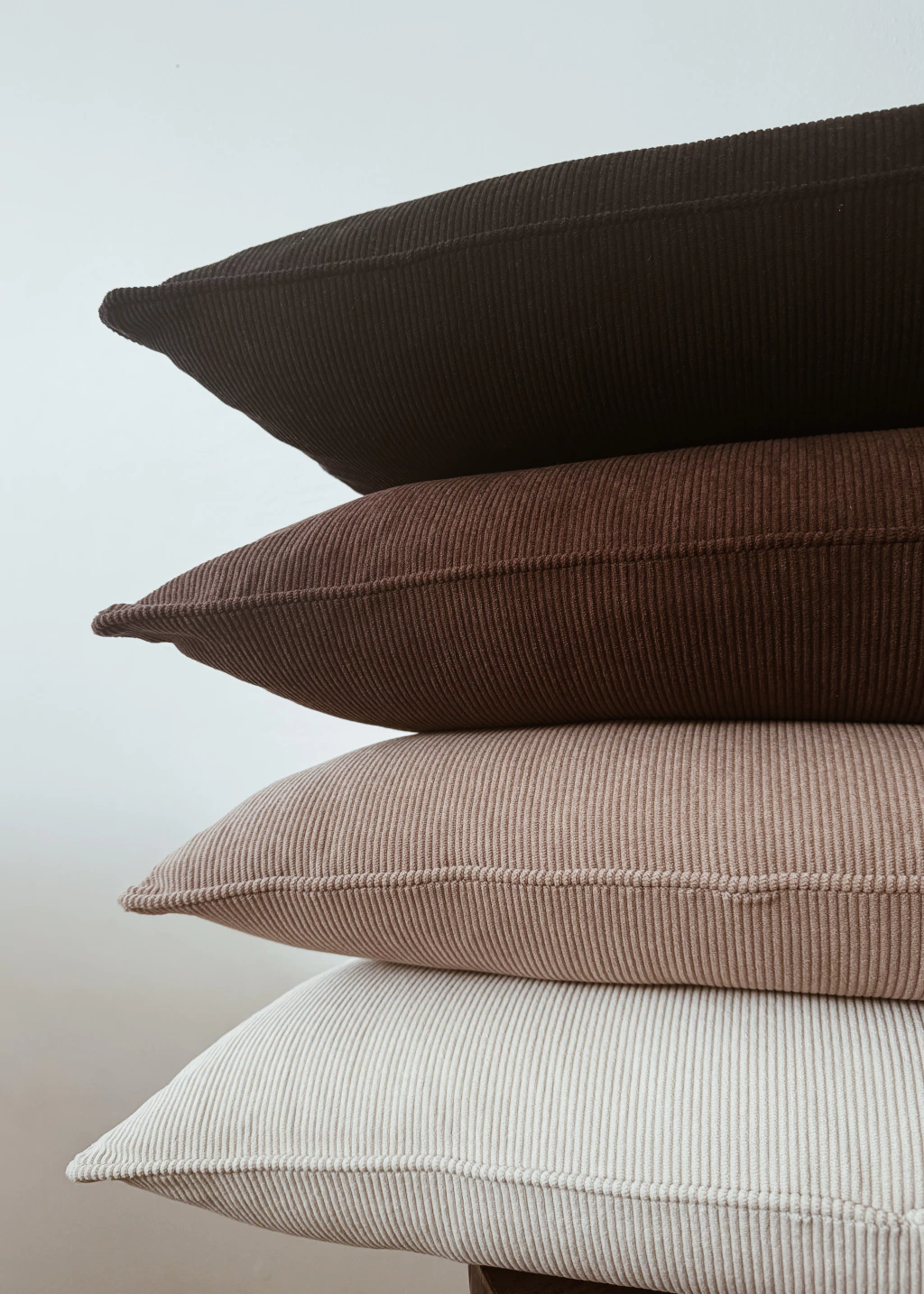 Almohadón relleno de vellón siliconado, con funda desmontable confeccionada artesanalmente en corderoy color marrón chocolate con vivo alrededor. Mi funda viene con cierre escondido en solapa.