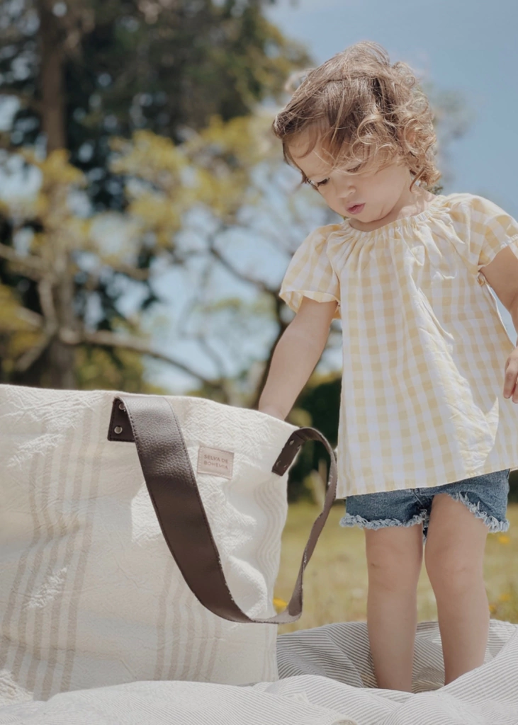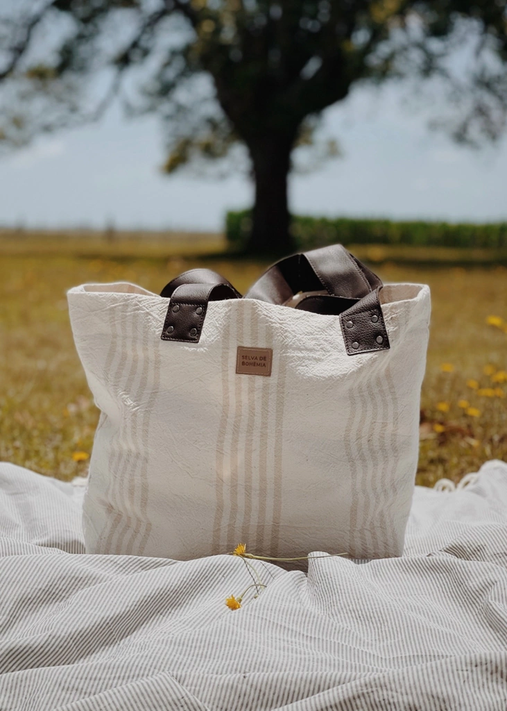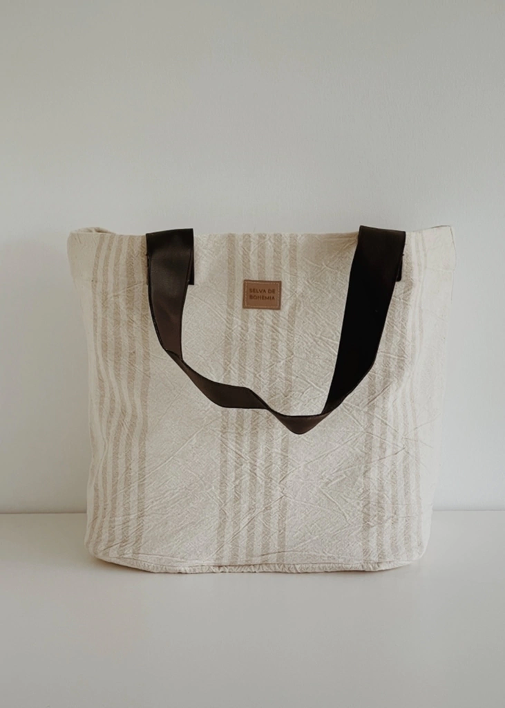 Tote bag playera confeccionada en tusor color natural con rayas color arena. Estoy plastificada por dentro con manijas de cuero ecológico marrón chocolate y remaches plata vieja.