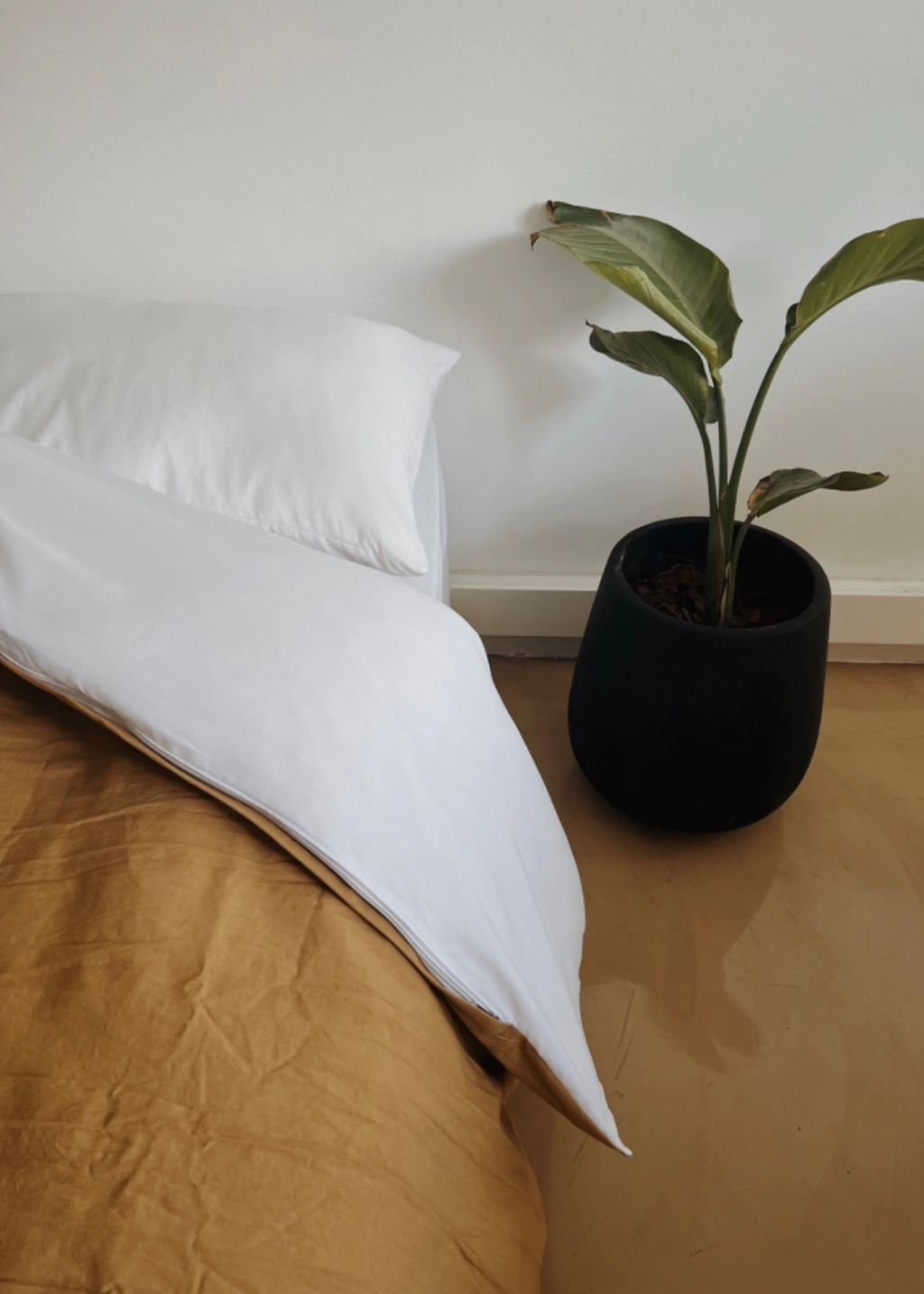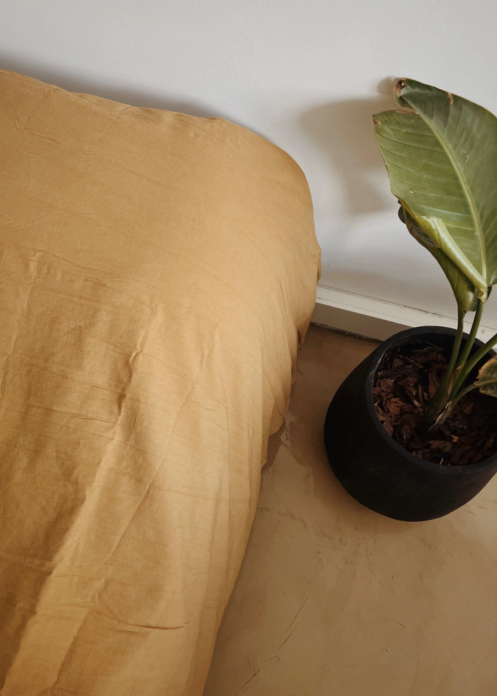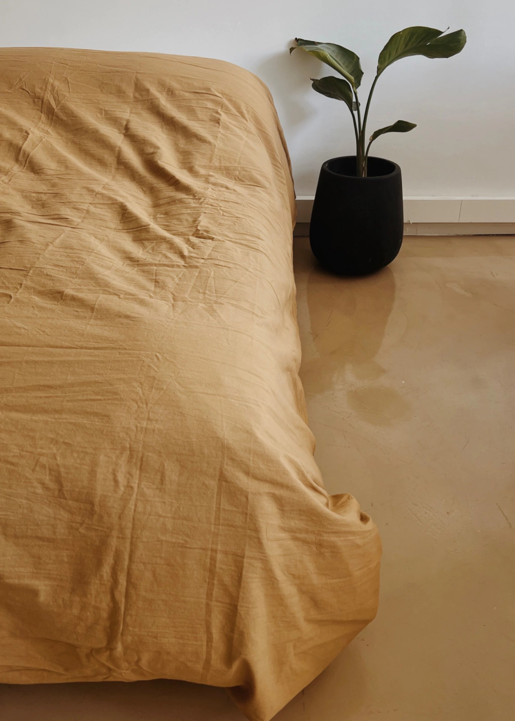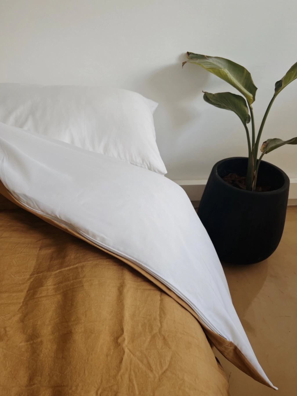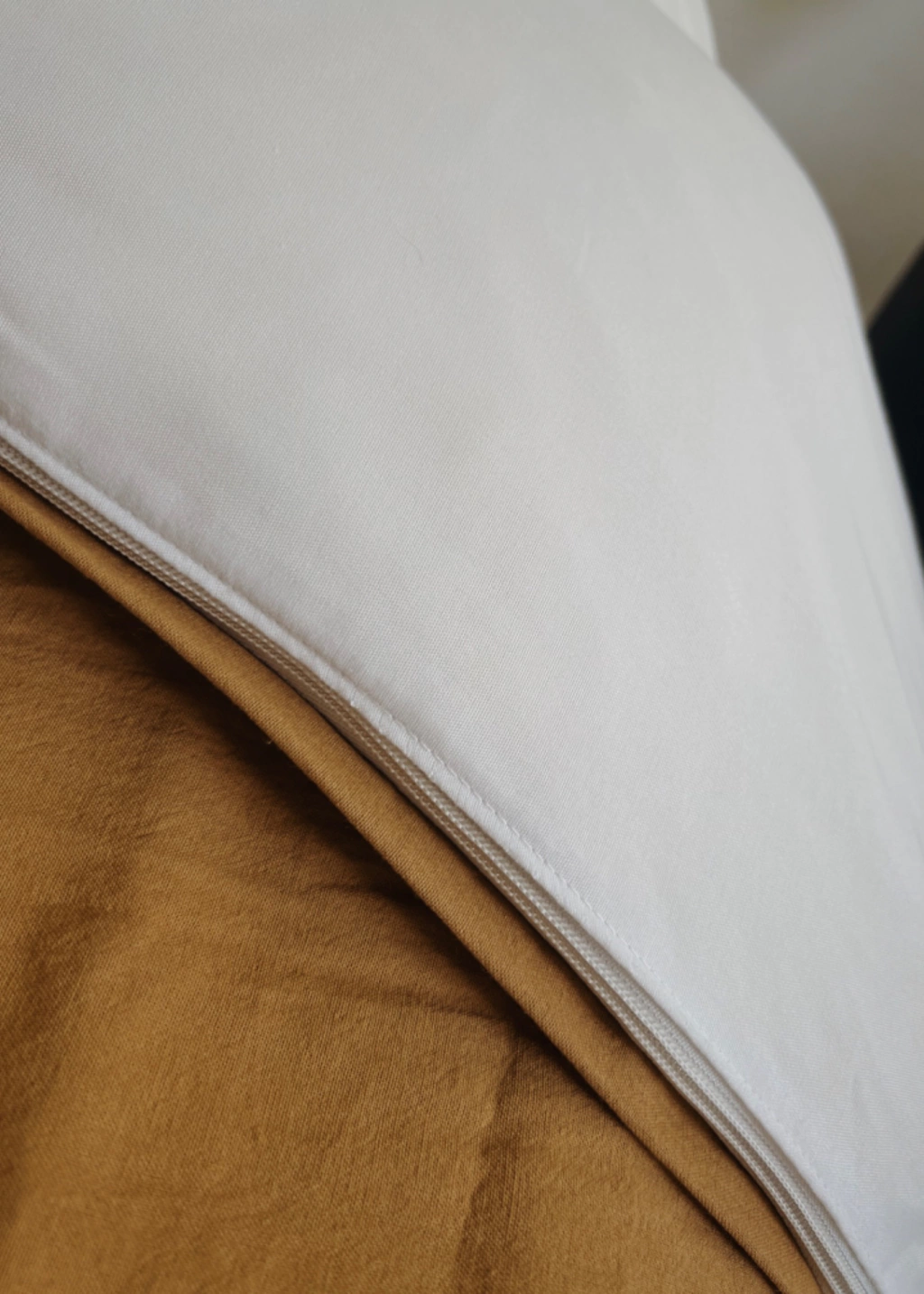 Funda para cubrir edredones, acolchados o plumones. Confeccionada de manera artesanal en lienzo 100% algodón (tusor liviano) color avellana en la cara superior y microfibra de poliester blanca (sabanera) en la cara inferior. Con cierre reforzado.