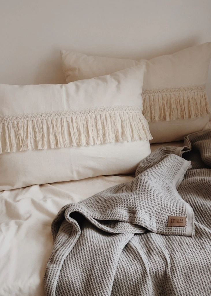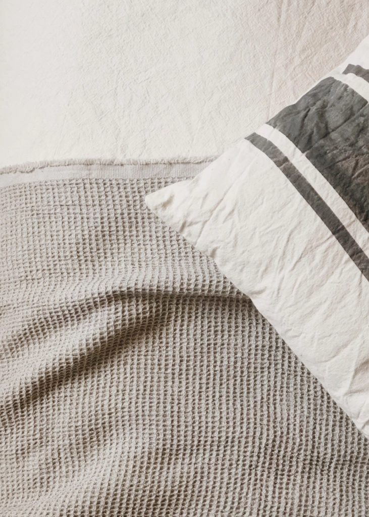 Manta confeccionada de manera artesanal en tejido waffle 100% algodón color gris perla.