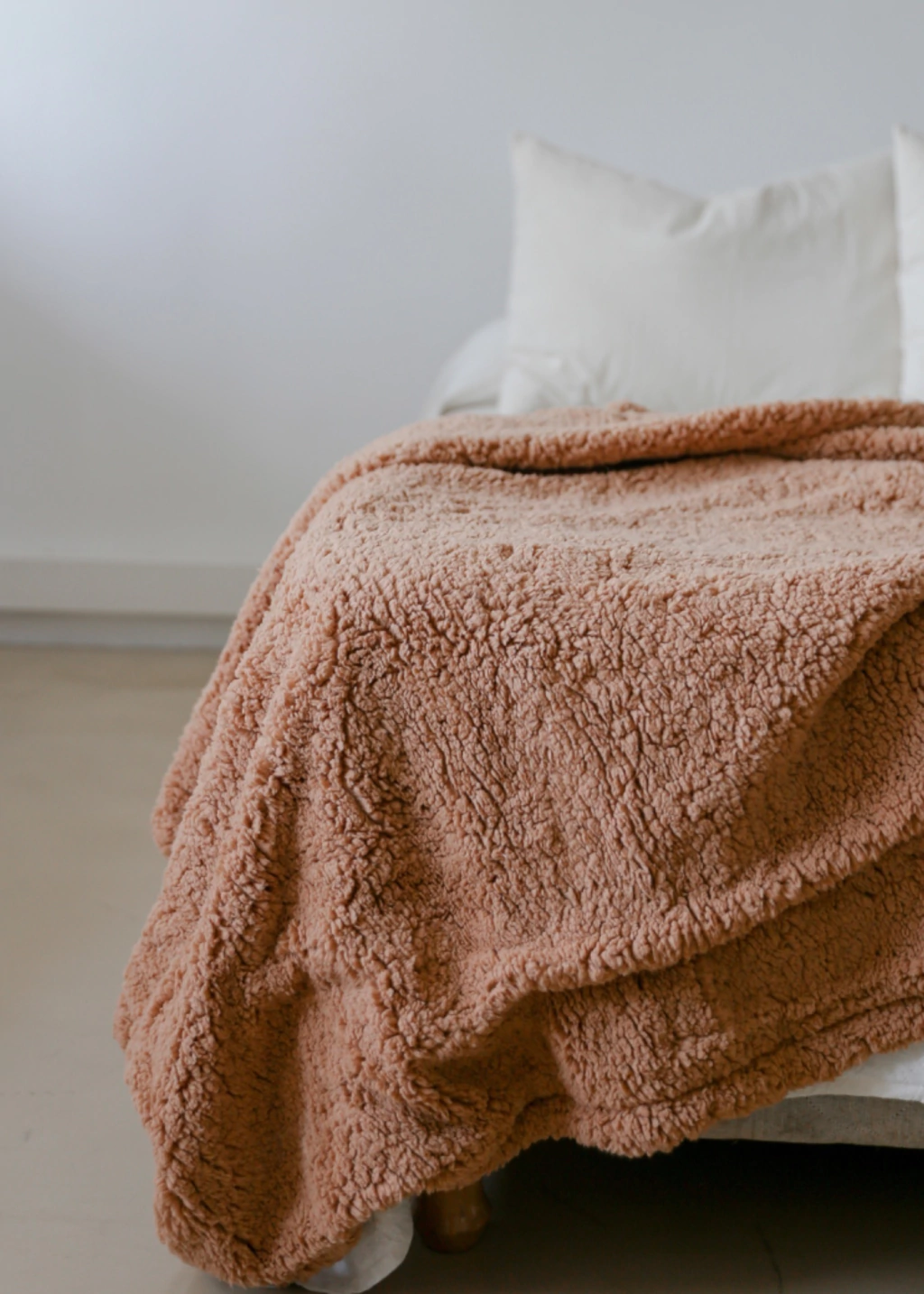 Manta o pie de cama, confeccionada artesanalmente con una cara en corderito HIPER suave color avellana, y otra cara en lienzo de algodón color natural.
