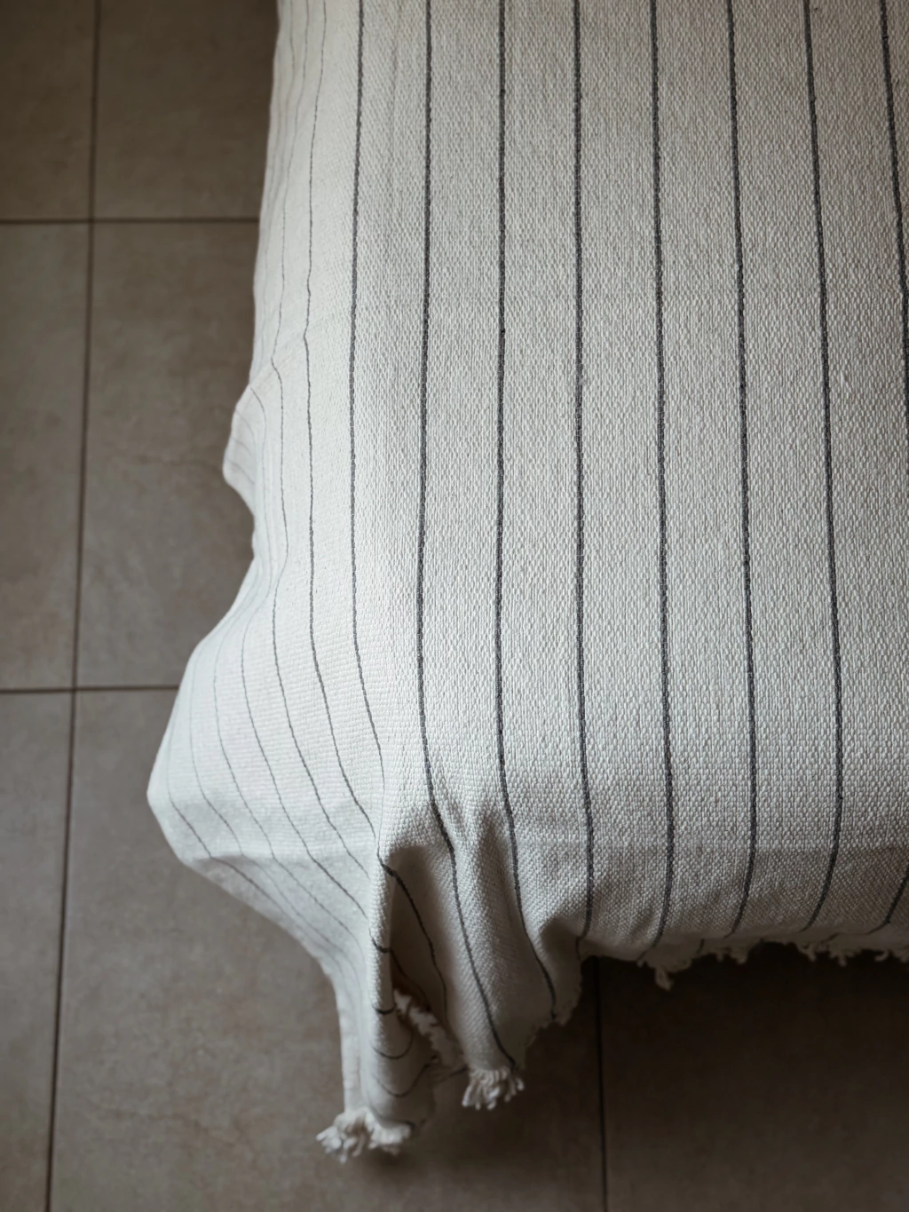 Manta o pie de cama, confeccionada artesanalmente en tejido pesado 100% algodón, color natural con raya gris azulada.