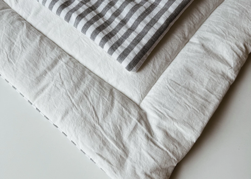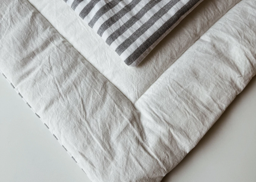 Pillow reversible relleno de guata, confeccionada artesanalmente en tusor rayado gris y blanco de un lado y tusor off white del otro lado, 100% algodón.